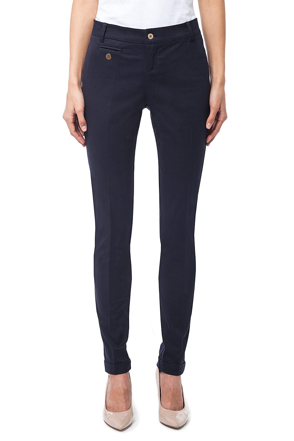 Прямые брюки со стрелкой выполнены из плотной эластичной хлопковой ткани. Низ брюк с узкой манжетой. Застежка на пуговицу и гульфик на молнии. Спереди декоративный карман в рамку с отделочной пуговицей, сзади карманы в рамку
