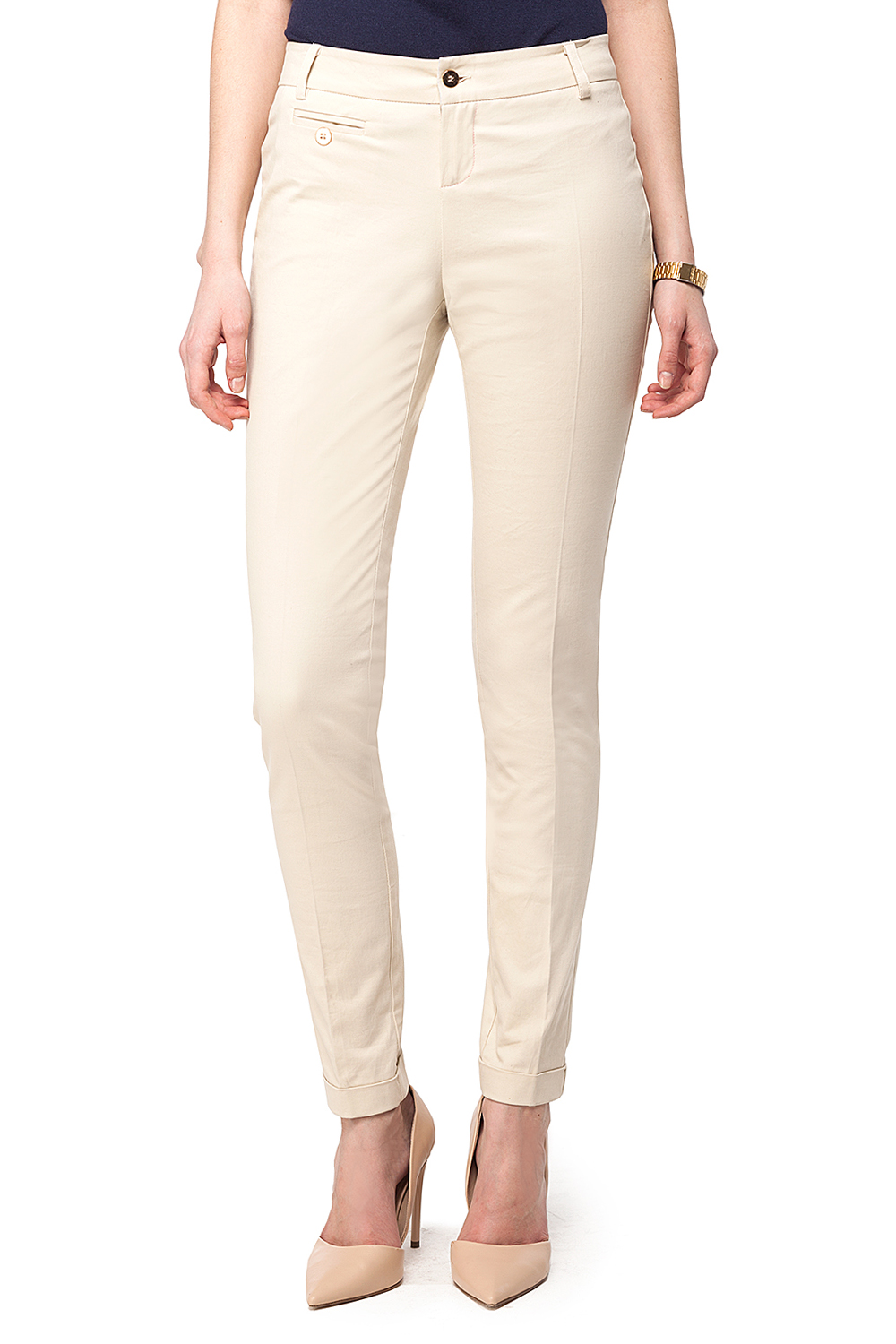 Прямые брюки со стрелкой выполнены из плотной эластичной хлопковой ткани. Низ брюк с узкой манжетой. Застежка на пуговицу и гульфик на молнии. Спереди декоративный карман в рамку с отделочной пуговицей, сзади карманы в рамку.