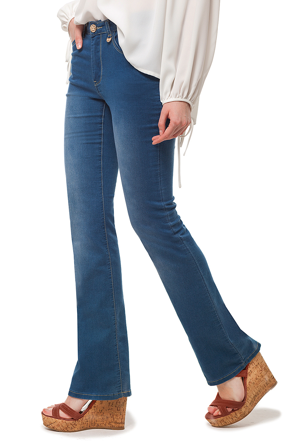 Джинсы-клеш выполнены из тонкого эластичного денима. Плотная посадка в верхней части и клеш от колена. Застежка на пуговицу и гульфик на молнии. Спереди на шлице декоративное металлическое логотипом.