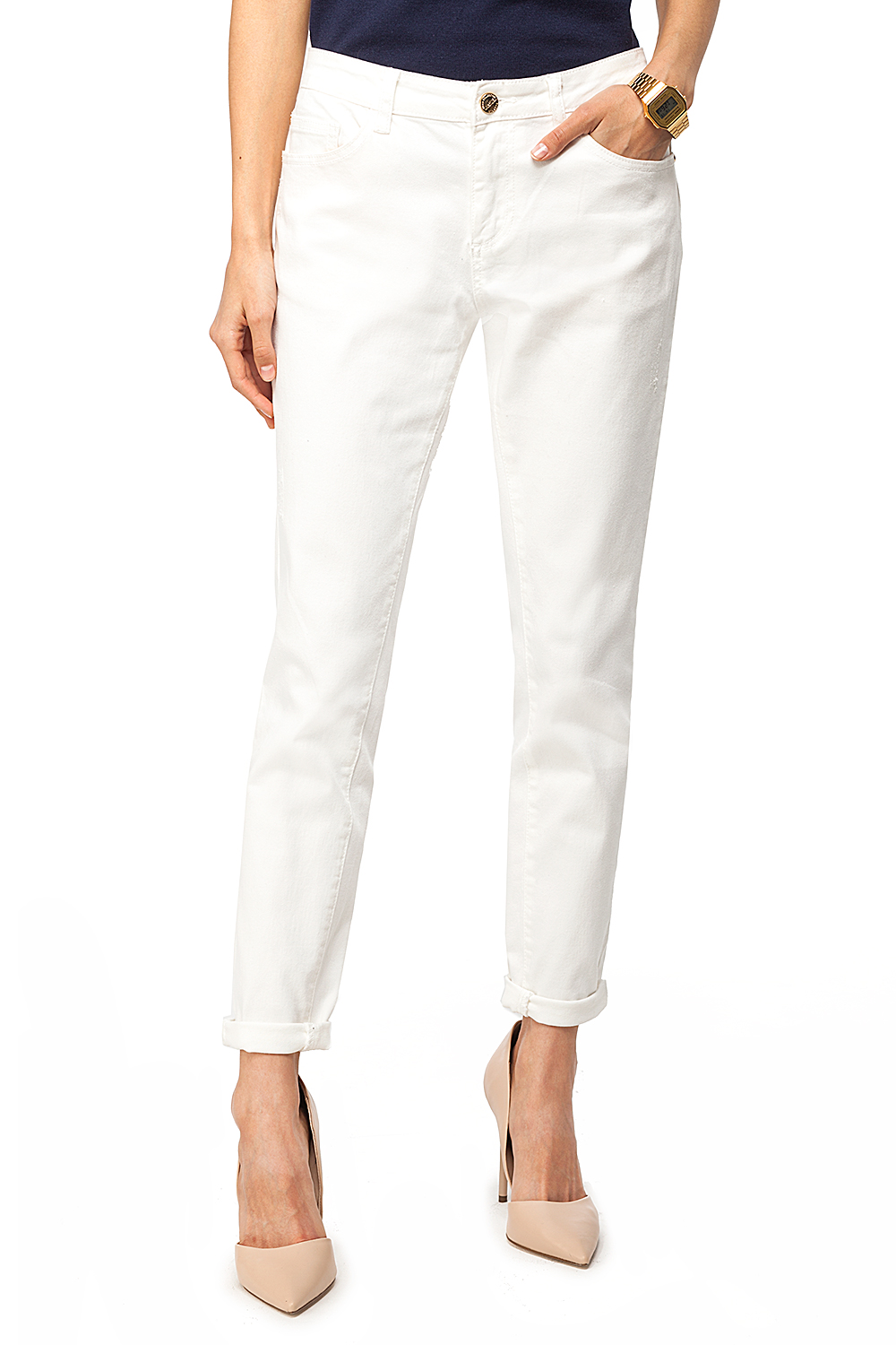 Джинсы "бойфренды" свободного силуэта на заниженной талии выполнены из эластичного хлопкового полотна. Покрой с пятью карманами. Застежка на пуговицу и гульфик на молнии.