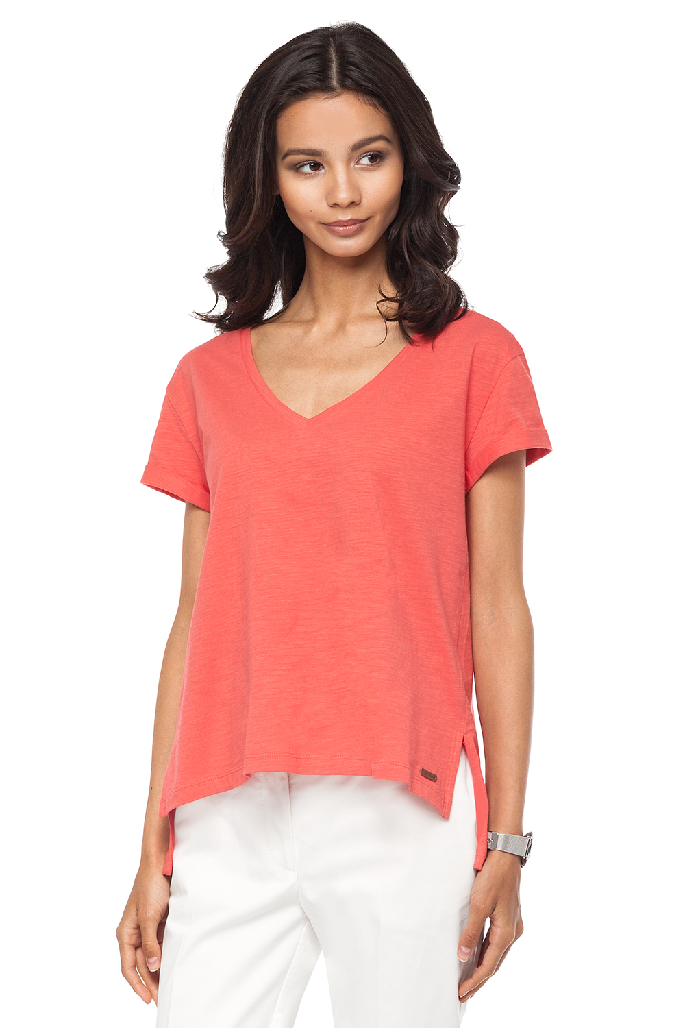 Хлопковая футболка свободного силуэта с глубоким V-образным вырезом и удлиненной спинкой. Универсальная модель, которая станет основой множества повседневных образов.