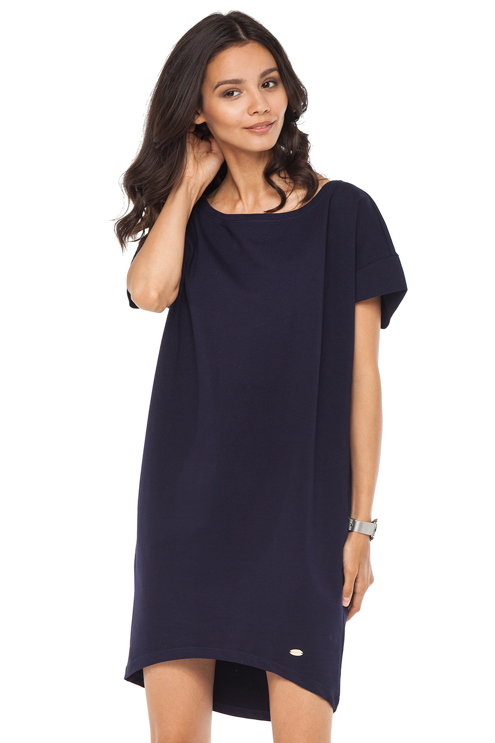 Платье-футболка свободного силуэта выполнено из эластичного двухниточного футера. Низ изделия ассиметричного кроя с удлиненной спинкой. Лаконичная модель станет универсальной вещью в летнем гардеробе.