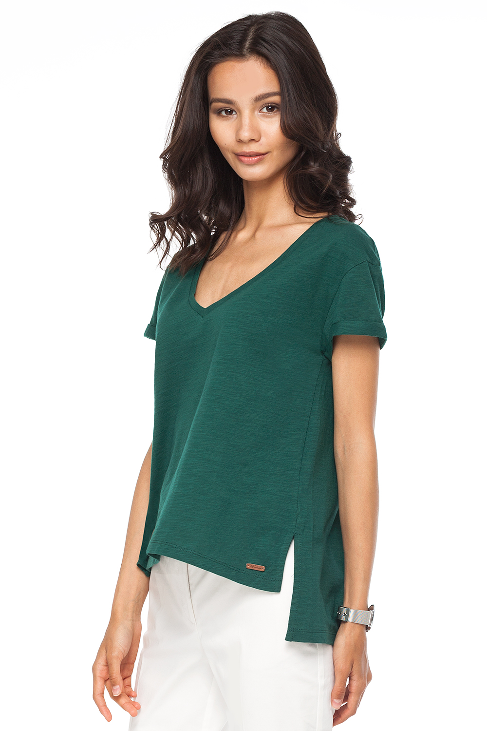 Хлопковая футболка свободного силуэта с глубоким V-образным вырезом и удлиненной спинкой. Универсальная модель, которая станет основой множества повседневных образов.