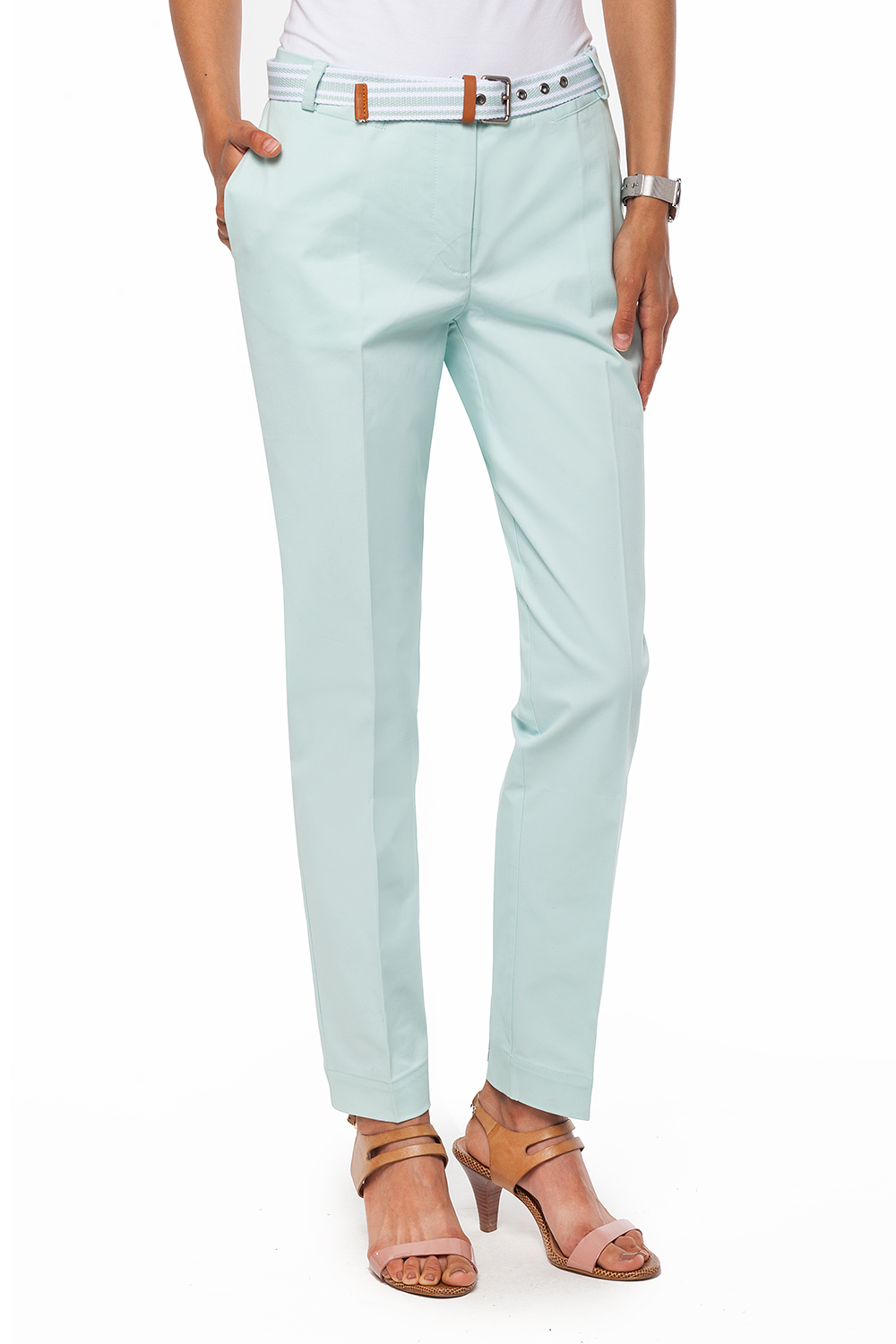 Укороченные брюки-дудочки со стрелкой выполнены из плотного хлопкового полотна с эластаном сатинового плетение с мягким атласным блеском. Спереди наклонные карманы, сзади карманы в рамку. Ремень входит в стоимость изделия.