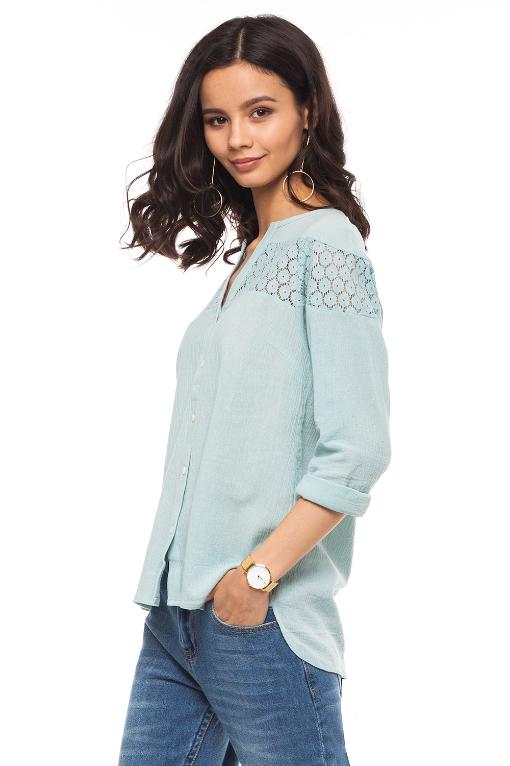 Женственная блузка свободного силуэта выполнена из хлопковой вуали с эффектом легкой жатки и дополнена декоративными вставками кружева. Изделие с V-образным вырезом горловины и укороченным рукавом. Идеальный выбор для создания повседневного расслабленного образа в паре с шортами или джинсами.