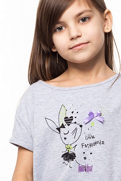 Футболка для девочки свободного кроя со спущенным плечом выполнена из эластичного хлопкового полотна. На груди декоративный принт с глиттером и атласным бантом. Рукава с манжетой.