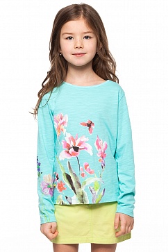 Футболка для девочки из фактурного хлопкового трикотажа. Свободный силуэт с удлиненной спинкой. Разрезы в боковых швах обработаны тесьмой контрастного цвета. Изделие декорировано принтом с глиттером по полочке и рукаву.