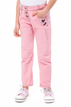 Брюки из плотной хлопковой ткани с эффектом стирки. Декоративные строчки выполнены нитками контрастного цвета, спереди под карманом вышиты бабочки. Застежка на гульфик на металлических пуговицах.