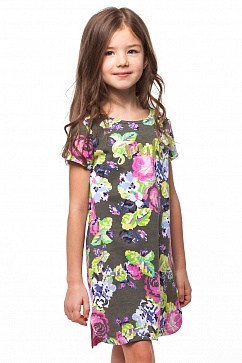 Платье свободного силуэта выполнено из принтованого футера. Спереди на груди декоративная вышивка. Застежка на спинке на потайную молнию. Внутренняя часть горловины и низ изделия обработаны контрастной бейкой.
