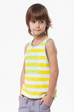 Майка-борцовка для мальчика из хлопкового полотна с принтованной полосой. Спереди декорирована принтом. Горловина и проймы обрботаны бейкой в цвет принта.