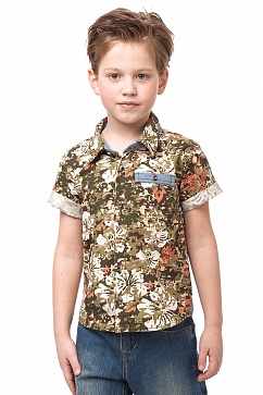 Рубашка для мальчика из принтованного хлопкового полотна. Планка кармана и треугольная вставка в боковом шве выполнены из тонкой джинсовой ткани.