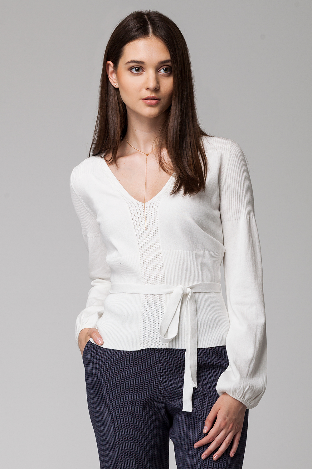 Оригинальная интерпретация классики. Изделие с глубоким V-образным вырезом выполнено из мягкой хлопковой пряжи. Широкий рукав со сборкой. Обтачка горловины выполнена фактурной вязкой. Низ изделия вязан резинкой, обеспечивая плотную посадку на талии. В комплекте узкий трикотажный пояс.
