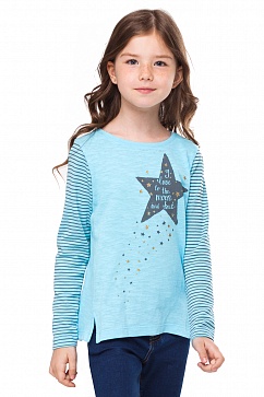 Футболка из хлопкового полотна, декорированная принтом с блестками. Изделие с удлиненной спинкой и двумя боковыми разрезами. Боковые швы смещены вперед.