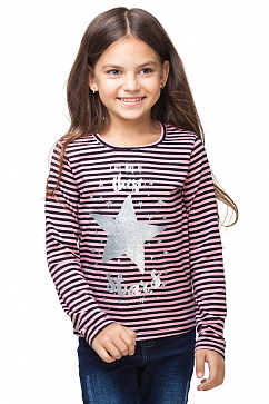 Футболка для девочки выполнена из эластичного хлопкового полотна в контрастную полоску. Спереди декоративный принт с глиттером.
