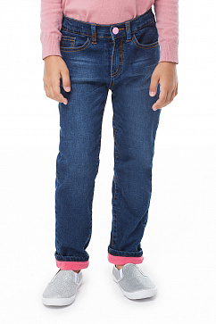 Джинсы для девочки, утепленные ФЛИСОМ розового цвета. Изделие декорировано потертостями, отделочные строчки и фурнитура контрастного цвета. Пояс с регулируемой резинкой для лучшей посадки на талии.