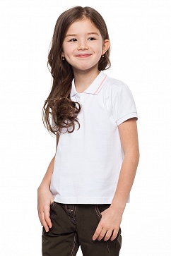 Футболка -поло из полотна пике со сборкой на плечах. По краю воротника - полоса контрастного цвета. Верхняя пуговица пришита нитками контрастного цвета.