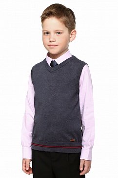 Жилет для мальчика связан из эластичной хлопковой пряжи. Низ изделия с контрастными полосками вязан широкой резинкой. Изделие дополнено кожаной нашивкой с логотипом.