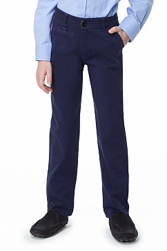 Брюки для мальчика выполнены из плотной хлопковой ткани. Декоративные отстрочки выполнены контрастными нитками. Спереди наклонные карманы, сзади карманы в рамку.