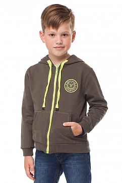 Толстовка из двухниточного футера. Спереди застежка на пластиковую молнию, капюшон регулируется шнуром контрастного цвета. На груди нашивка с принтом.