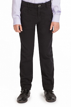 Брюки для мальчика выполнены из плотной хлопковой ткани. Декоративные отстрочки выполнены контрастными нитками. Спереди наклонные карманы, сзади карманы в рамку.