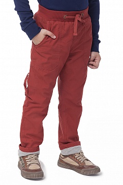 Брюки с легким эффектом стирки на трикотажной подкладке. Пояс на рибане с резинкой. Спереди накладные карманы.