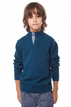 Джемпер выполнен из хлопковой пряжи меланж с добавлением акрила для придания формоустойчивости. Воротник-стойка с застежкой на планку на пуговицах. Снизу декоративная нашивка с логотипом.