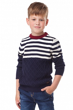 Джемпер выполнен из плотной хлопковой пряжи с добавлением акрила для придания формоустойчивости. Воротник контрасного цвета, спереди декоративная вязка косами. Снизу декоративная нашивка с логотипом.