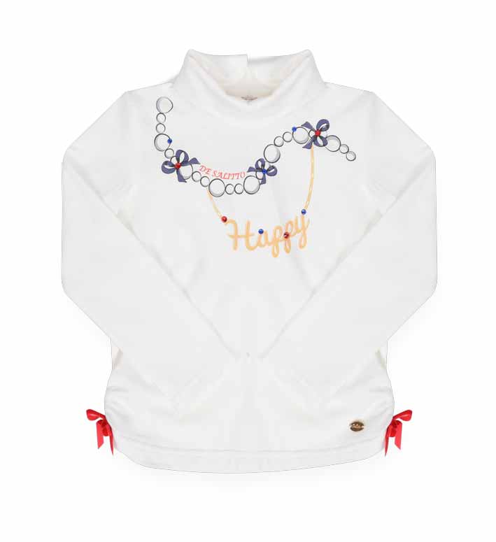 De Salitto Fashionista 17315-G Водолазка 67% хлопок, 27% полиэстер, 6% эластан Водолазка трикотажная с длинными втачными рукавами. На полочке принт, имитирующий бусы с цветными стразами. По боковым швам небольшая сборка, декорирована бантиками. молочный / цена- 930,00 руб. размер 98