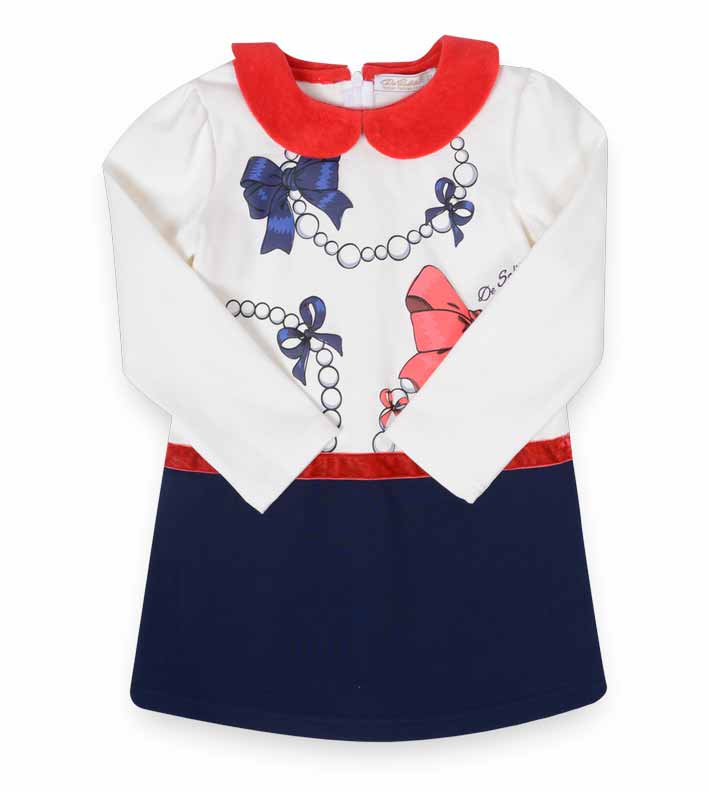 De Salitto Fashionista 17323-G Платье 60% хлопок, 33% полиэстер, 7% эластан Платье трикотажной отрезное по талии. А-силуэт. Рукава длинные втачные. Круглый воротник контрастный по цвету. Юбка из однотонного трикотажа контрастного цвета. Полочка с принтом. молочный/синий / цена- 1700,00 руб. размер 98