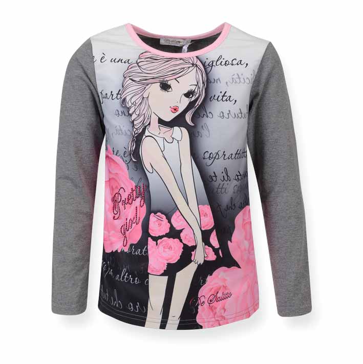 De Salitto Peonies 17292-I Кофта 95% хлопок 5% эластан Туника трикотажная с длинными втачными рукавами. Рукава и спинка из трикотажа-меланж. На полочке - принт, логотип и надпись выложены стразами. По горловине контрастная окантовка. серый / цена- 1310,00 руб. размер 116
