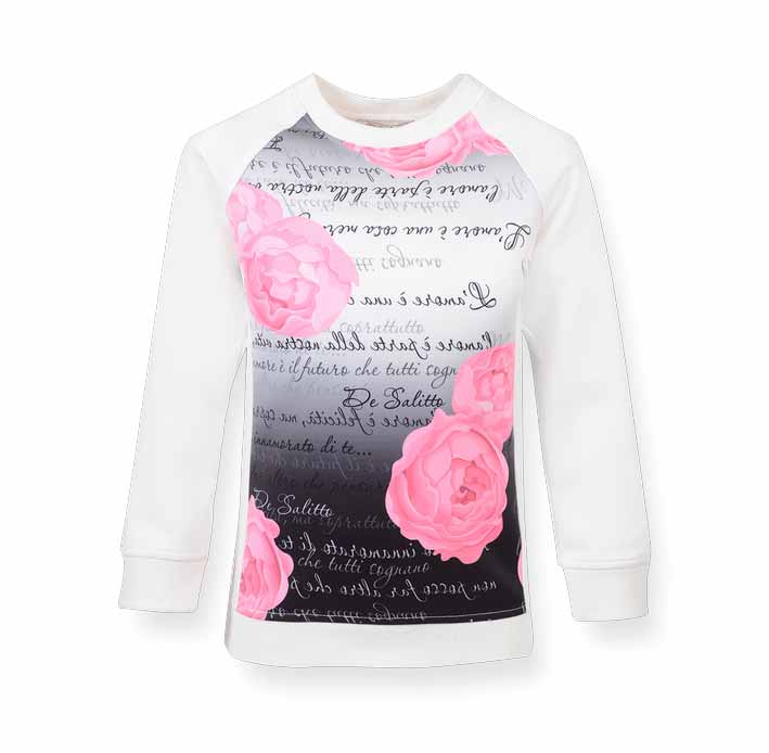 De Salitto Peonies 17295-I Кофта 95% хлопок 5% эластан Туника трикотажная с длинными рукавами-реглан с манжетами. Поолочка принтованная, спинка, рукава и боковые части полочки - однотонные. Горловина, манжеты и низ изделия - риб. молочный/черный / цена- 1450,00 руб. размер 140
