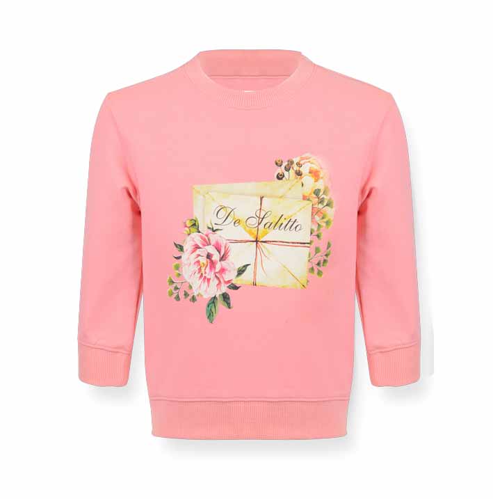 De Salitto Peonies 17296-I Кофта 95% хлопок 5% эластан Свитшот трикотажный с втачными рукавами длиной 3/4. На полочке принт пластезолью., низ - фигурный. По горловине, низу изделия. Манжеты - риб. розовый / цена- 1380,00 руб. размер 116