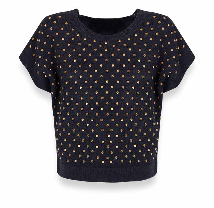 De Salitto Tinker 17216-E Кофта 10% шерсть, 30% вискоза 50% хлопок, 10% нейлон Топ из вязаного трикотажа. Силуэт oversize. Перед топа декорирован клеющимися клепками-полусферами золотого цвета. черный / цена- 1670,00 руб. размер 162