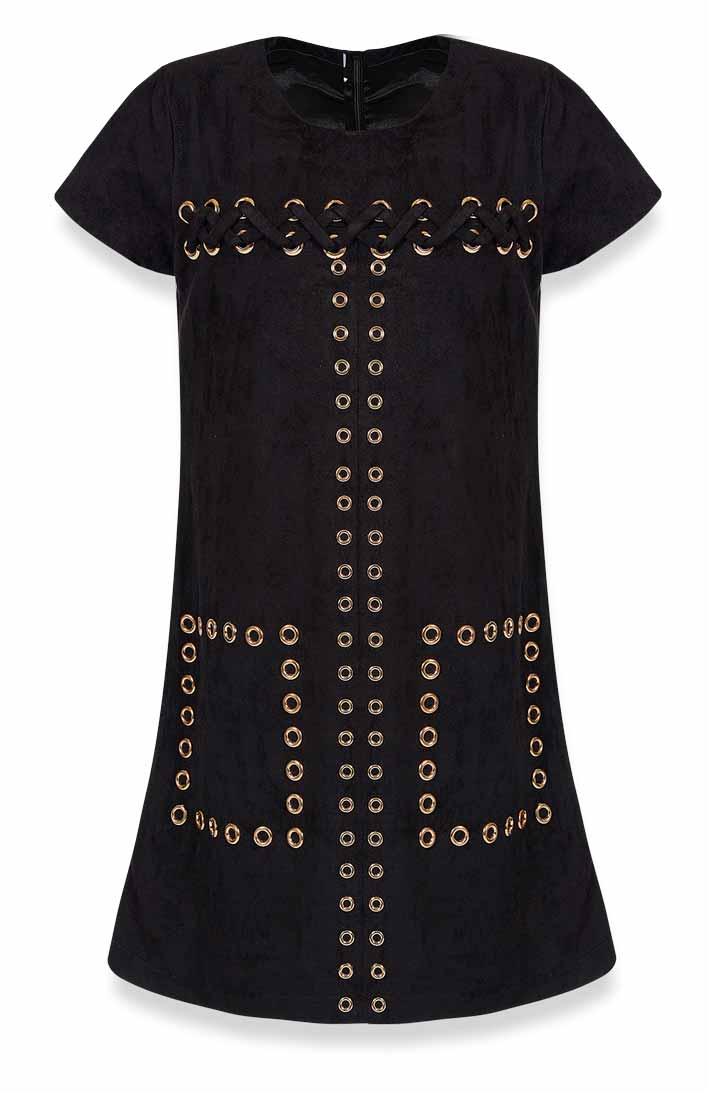 De Salitto Tinker 17214-E Платье 50% хлопок, 45% полиэстер, 5% эластан. Подклад 95% хлопок 5% спандекс Платье из замши черного цвета. Кокетка переда декорирована шнурами из основной ткани и люверсами. Перед платья декорирован люверсами золотого цвета. Спинка с центральным швом и потайной замком-молнией. черный / цена- 2240,00 руб. размер 162
