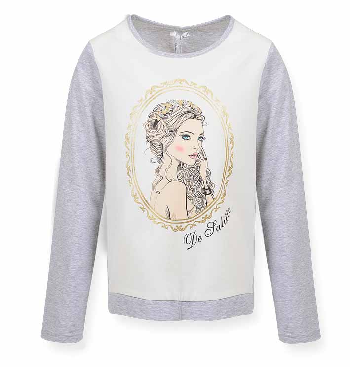 De Salitto Glossy 17458-P Футболка длинный рукав 95% хлопок 5% спандекс Футболка комбинированная трикотажная с длинными рукавами. Спинка, рукава из трикотажа-меланж. Полочка с водным и фойл принтом . Боковые швы переведены вперед с разрезами. Спинка удлиненная. серый / цена- 960,00 руб. размер 140