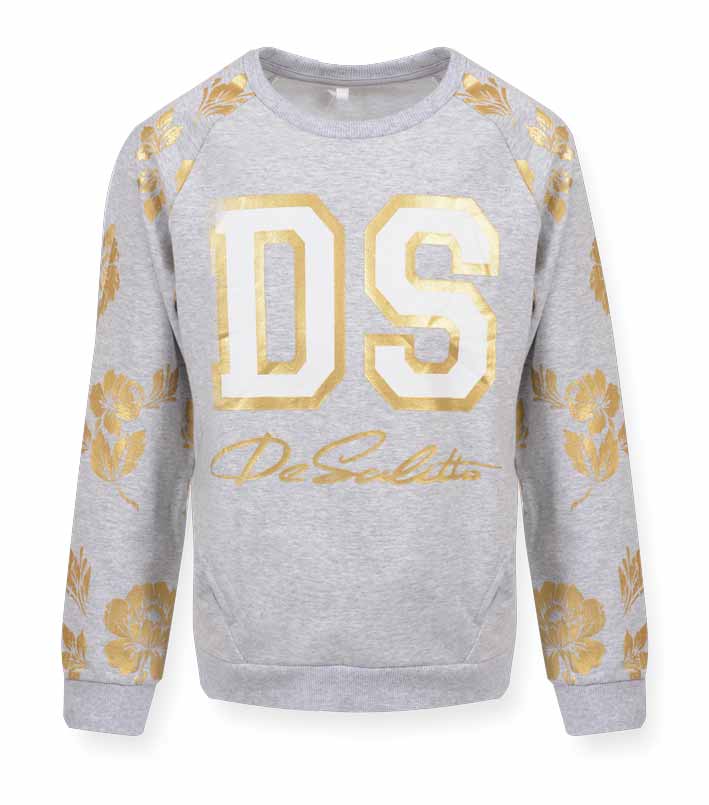 De Salitto Glossy 17463-P Кофта 95% хлопок 5% спандекс Свитшот трикотажный с рукавами-реглан. Рукава длинные с золотым фойл-принтом, с манжетой. Спинка и полочка меланжевые, на полочке принт, логотип нанесен пластезолью и фойл-принт. Передние карманы в диагональные подрезах, мешковина карманов цельная. серый / цена- 1530,00 руб. размер 140
