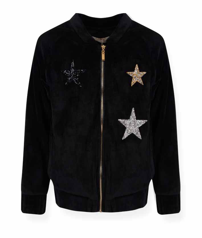 De Salitto Tinker 17227-E Кофта на молнии 60% хлопок, 35% полиэстер, 5% эластан Спортивная куртка из велюрового полотна. Рукав реглан. Полочки декорированы звездами с стеклярусом. Спинка декорирована нашивкой из пайеток. черный / цена- 2440,00 руб. размер 140