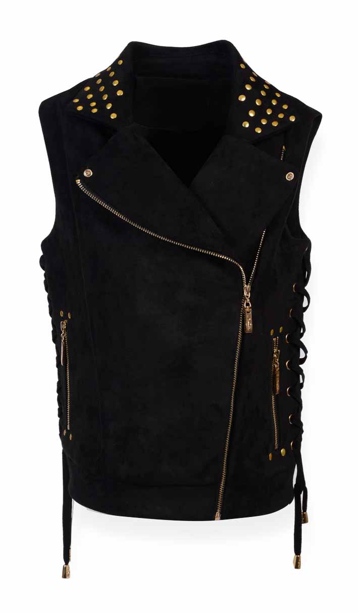 De Salitto Tinker 17213-E Жилет 50% хлопок, 45% полиэстер, 5% эластан. Подклад 95% хлопок 5% спандекс Жилет-косуха из замши черного цвета. Боковые швы декорированы шнурами из основной ткани и люверсами золотого цвета. Воротник жилета декорирован клепками золотого цвета. черный / цена- 2590,00 руб. размер 150