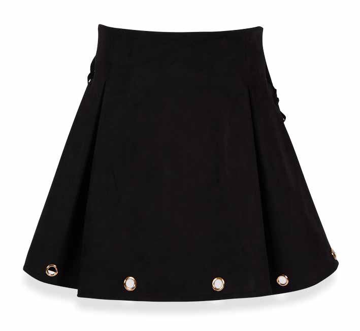 De Salitto Tinker 17212-E Юбка 50% хлопок, 45% полиэстер, 5% эластан. Подклад 95% хлопок 5% спандекс Юбка из замши черного цвета. Боковые швы юбки декорированы шнурами из основной ткани. Низ юбки декорирован люверсами золотого цвета. черный / цена- 2120,00 руб. размер 158