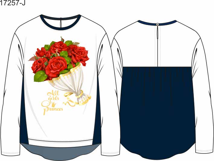 De Salitto Minnie 17257-J Футболка длинный рукав 65% хлопок, 30% полиэстер, 5% эластан Трикотажная туника с длинным рукавом. На передней полочке принт "Minnie Mouse". Сзади вставка из плотного принтованного шифона в горох. молочный / цена- 1320,00 руб. размер 122