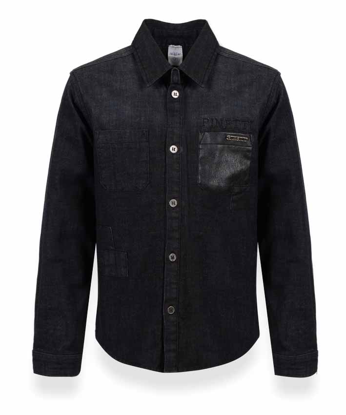 Pinneti London 517111-A Рубашка 95% хлопок 5% спандекс Ткань: джинса. Рубашка с накладным карманом из эко-кожи, с декоративными заплатками. Рукава длинные, втачные на манжете. черный / цена- 1400,00 руб. размер 150