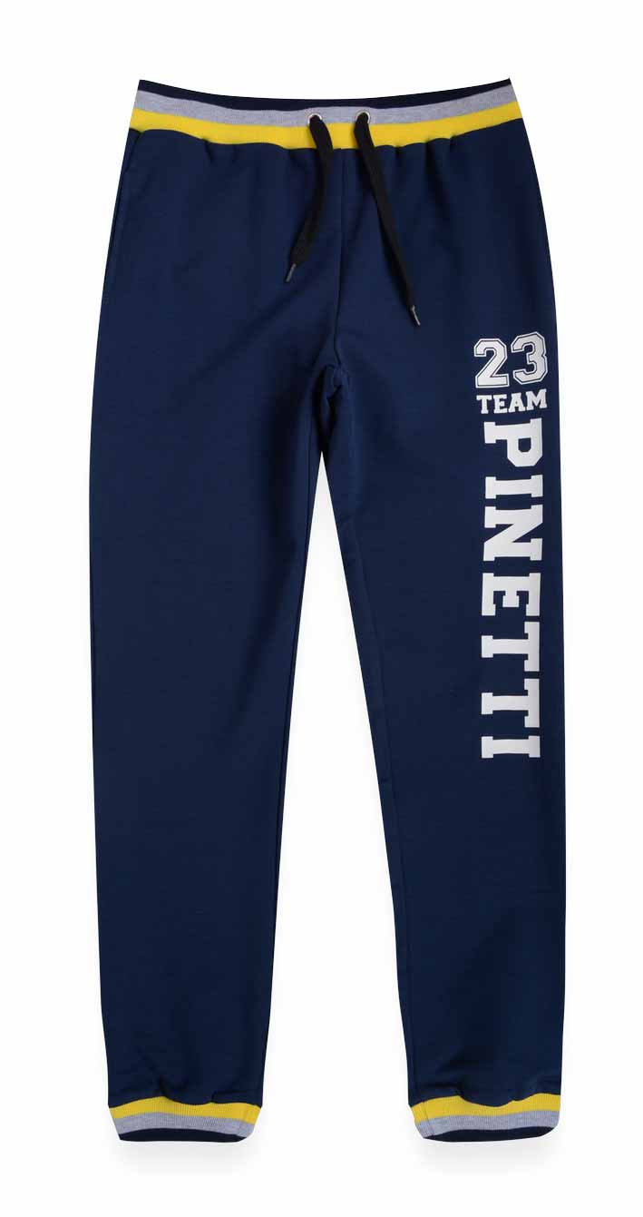 Pinneti College 517201-F Брюки 95% хлопок 5% спандекс Брюки трикотажные на манжетах. Карманы в боковых швах, на заднем накладном карманк - нашивка. Принт пластезолью на левой брючине. На поясе и манжетах - контрастные полоски. синий / цена- 1570,00 руб. размер 162