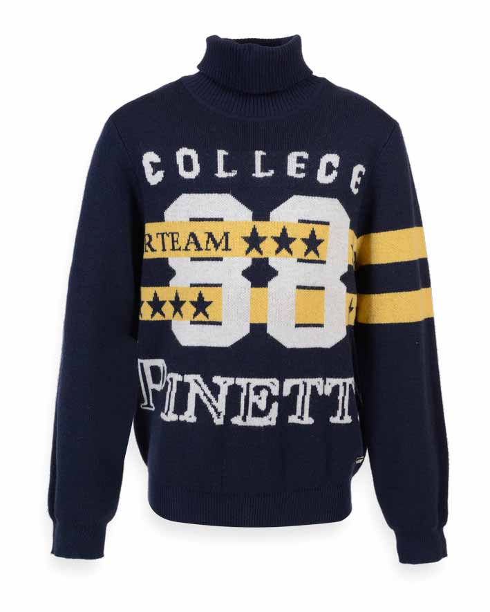 Pinneti College 517209-F Джемпер 10% шерсть, 30% вискоза 50% хлопок, 10% нейлон Водолазка вязаная с длинными втачными рукавами. На полочке и рукаве рисунок вывязаный. синий / цена- 2040,00 руб. размер 140