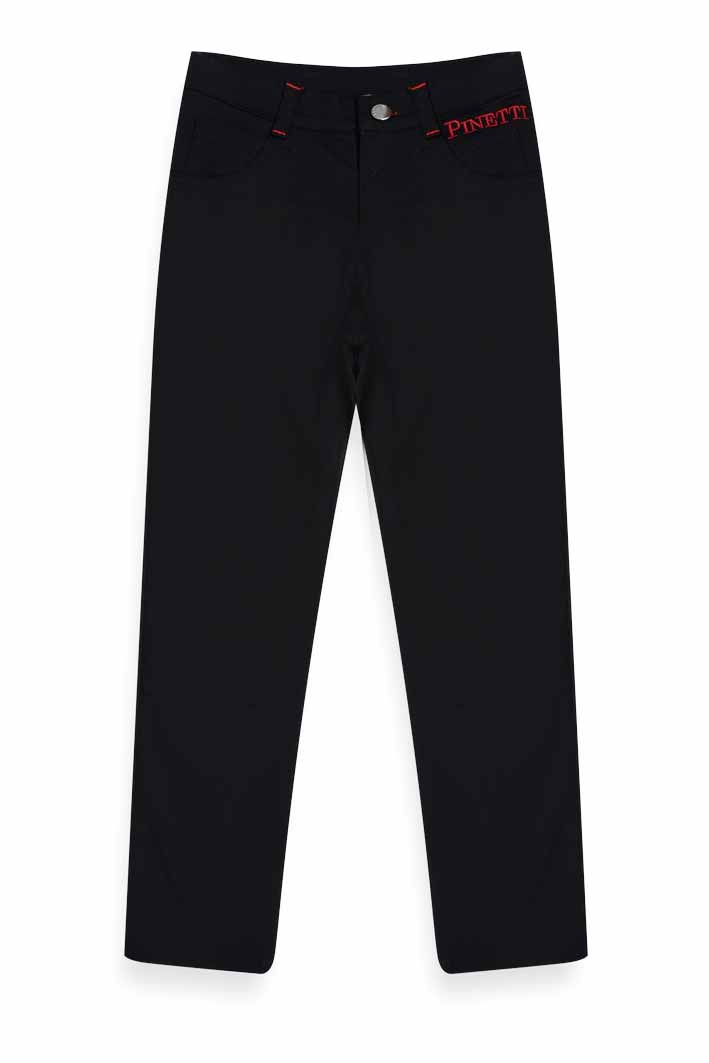 Pinneti London 517113-A Брюки 95% хлопок 5% спандекс Ткань: джинса. Брюки с карманами. Вышитый логотип Pinetti на левом кармане. Закрепки на шлевках и вышивка - красного цвета. черный / цена- 1820,00 руб. размер 130
