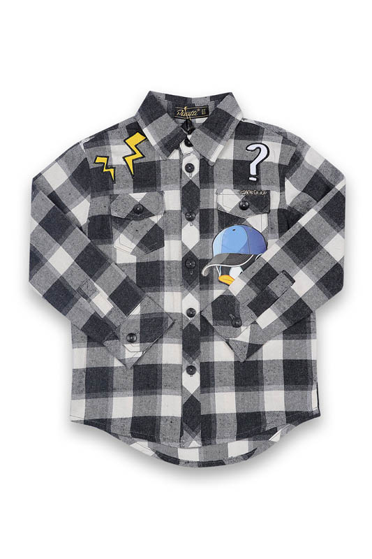Pinneti 517126-B Рубашка 95% хлопок 5% спандекс Рубашка из фланели с клетчатым рисунком. Полочки декорированы нашивками. Спинка с кокеткой, кокетка декорирована принтом. серый/белый / цена- 1310,00 руб. размер 98