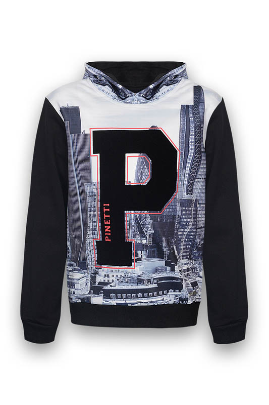 Pinneti London 517106-A Кофта 95% хлопок 5% спандекс Ткань: трикотаж. Толстовка из принтоновоного трикотажа с капюшоном. Рукав отрезной, длинный, однотонный на манжете-рип. серый / цена- 1370,00 руб. размер 130