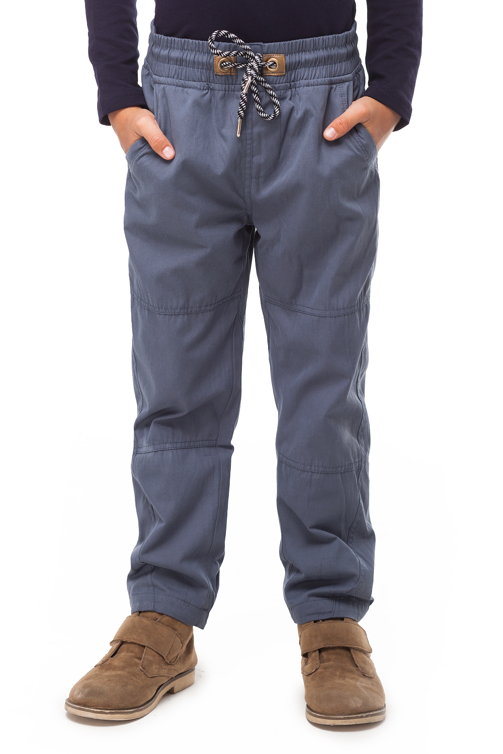 Брюки свободного кроя выполнены из смесовой ткани на хлопковой подкладке. Широкий пояс на резинке с завязкой на шнурок. Модель с четырьмя карманами и фурнитурой контрастного цвета.