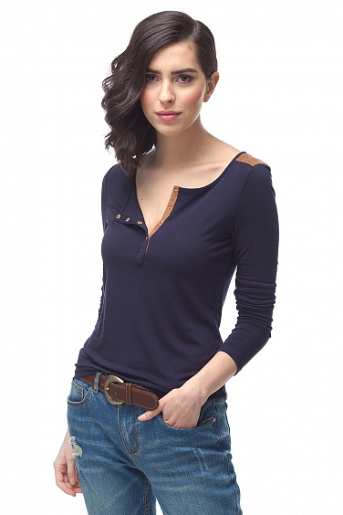 Тонкий трикотажный джемпер из качественной эластичной вискозы. Приталенный силуэт, застежка на планку на небольших золотистых кнопках. На плечах и планке декоративные вставки из иск. замши.