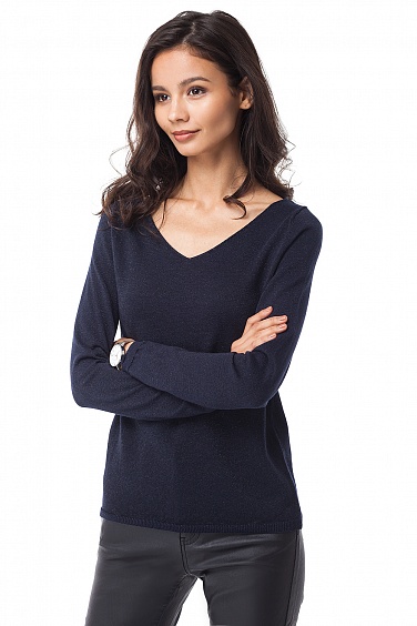 Джемпер свободного силуэта с глубоким V-образным вырезом. Изделие выполнено из тонкого трикотажа с добавлением люрекса, придающего эффект мягкого металлического блеска.