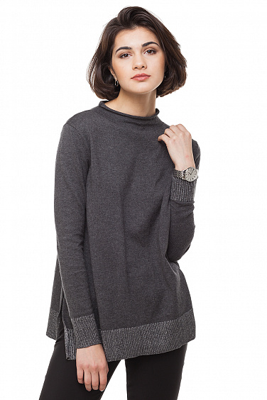 Трикотажный свитер свободной посадки выполнен из хлопковой пряжи с добавлением нейлона для придания формоустойчивости. Изделие прямого кроя с отделкой люрексом и высокими разрезами в боковых швах. Воротник-стойка с необработанным краем.